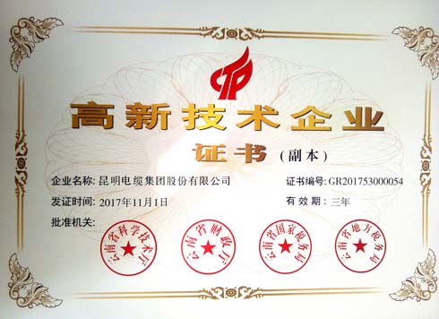 2017年12月,昆明電纜集團(tuán)股份有限公司再次通過了高新技術(shù)企業(yè)的認(rèn)定,被云南省科學(xué)技術(shù)廳、云南省財(cái)政廳、云南省國家稅務(wù)局、云南省地方稅務(wù)局認(rèn)定為“高新技術(shù)企業(yè)”。