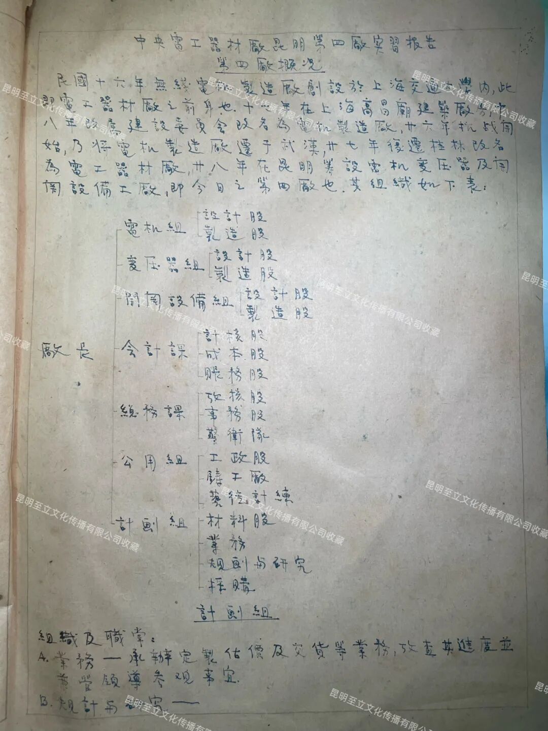 該《暑期實(shí)習(xí)報(bào)告》系手寫稿,圖文并茂,封面封底外,內(nèi)頁23頁,內(nèi)容和要素都非常完整。許昭炎原系清華大學(xué)學(xué)生,此手稿是研究西南聯(lián)大、清華大學(xué)、抗戰(zhàn)時(shí)期中央電工器材廠的珍貴一手資料,因是手稿,故獨(dú)一無二!審閱者為中央電工器材廠第一廠和第四廠廠長(zhǎng)張承祜(見印鑒)。西南聯(lián)大被譽(yù)為“中國教育史上的珠穆朗瑪峰”,這從這份科學(xué)、嚴(yán)謹(jǐn)而又富有創(chuàng)見的聯(lián)大學(xué)子許昭炎的實(shí)習(xí)報(bào)告中,得到了充實(shí)、飽滿、豐富的印證!