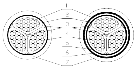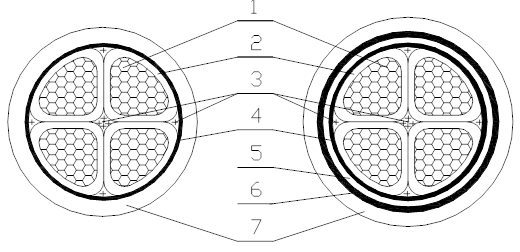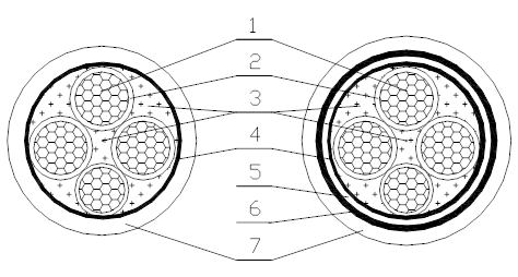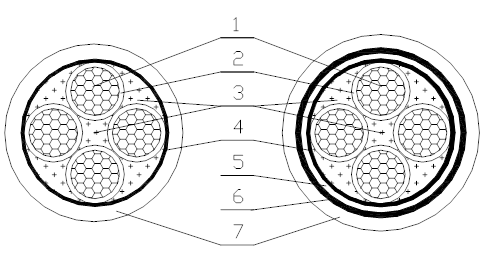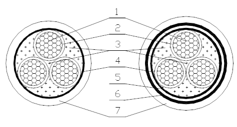 1 導體 2 絕緣 3填充 4 包帶 5 內(nèi)襯層 6 鋼帶 7 外護套